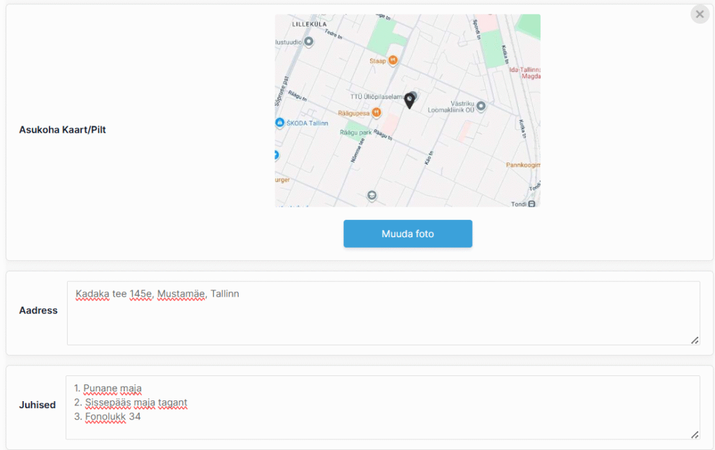 • Asukoha Kaart/Pilt: Kaart kuvatakse automaatselt aadressi põhjal.