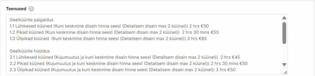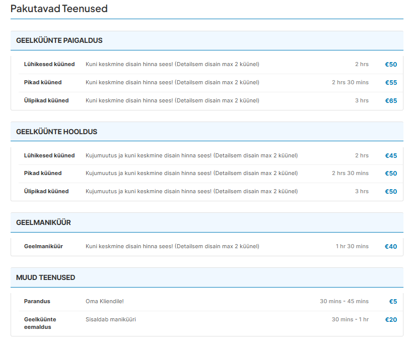 Näide: Geelküünte paigaldus 1.1 Lühikesed küüned (Kuni keskmine disain hinna sees! (Detailsem disain max 2 küünel)) 2 hrs €50 1.2 Pikad küüned (Kuni keskmine disain hinna sees! (Detailsem disain max 2 küünel)) 2 hrs 30 mins €55 1.3 Ülipikad küüned (Kuni keskmine disain hinna sees! (Detailsem disain max 2 küünel)) 3 hrs €60