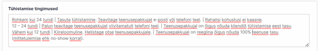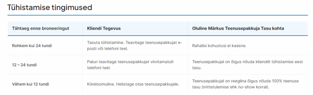 Näide: Rohkem kui 24 tundi | Tasuta tühistamine. Teavitage teenusepakkujat e-posti või telefoni teel. | Rahalisi kohustusi ei kaasne. 12 – 24 tundi | Palun teavitage teenusepakkujat viivitamatult telefoni teel. | Teenusepakkujal on õigus nõuda kliendilt tühistamise eest tasu. Vähem kui 12 tundi | Kiireloomuline. Helistage otse teenusepakkujale. | Teenusepakkujal on reeglina õigus nõuda 100% teenuse tasu (mittetulemise ehk no-show korral).