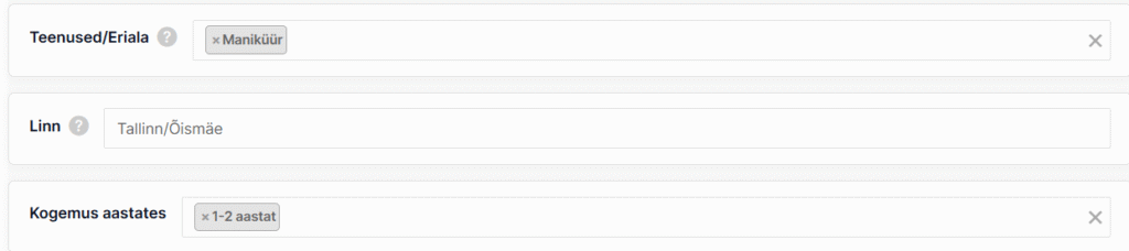 Pane tähele! Esimesed kolm välja – Teenused/Eriala, Linn ja Kogemus – on eriti olulised. Neid kuvatakse sinu profiilikaardil “Teenusepakkujad” nimekirjas, otse sinu nime all. See on esimene lühiinfo, mida klient sinu kohta näeb.