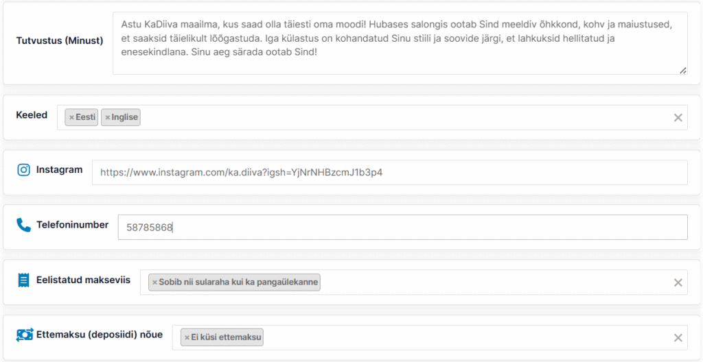 • Teenused/Eriala: Lühike kokkuvõte sinu peamistest teenustest (nt “Maniküür”, “Juuksur”, “Kosmeetik”).