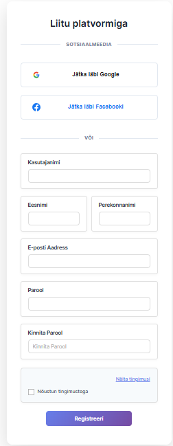4. Alternatiivina saad registreeruda ka käsitsi, valides kasutajanime ning sisestades oma e-posti ja parooli.